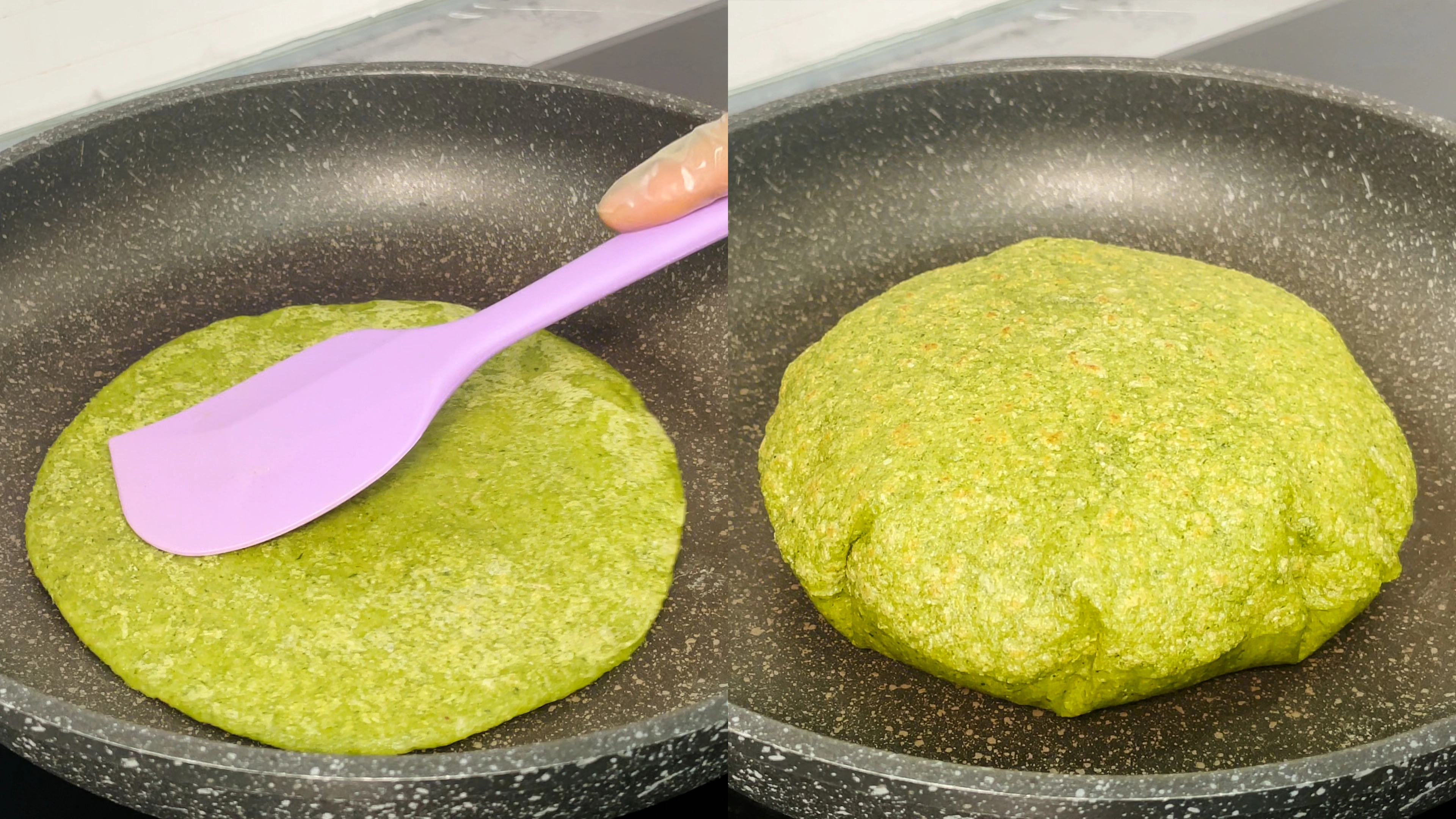 - Sau khoảng 1–2 phút, khi thấy mặt dưới xém vàng thì lật bánh.