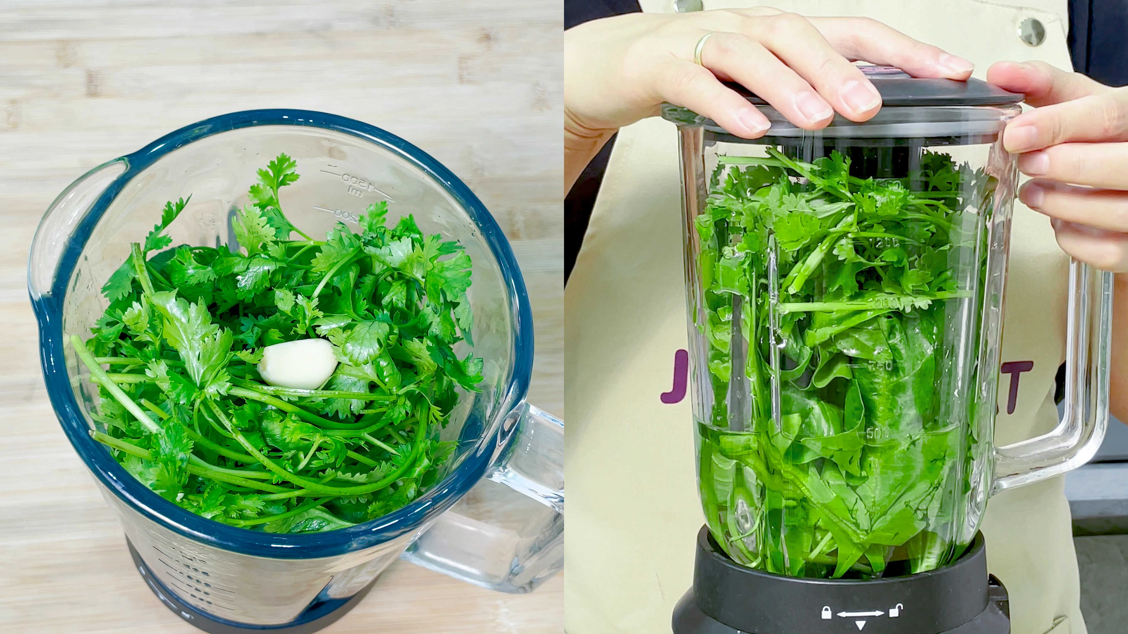 - Cho vào máy xay: 100g cải bó xôi + 20g rau mùi + 1 tép tỏi + 1g muối + 400ml nước.
