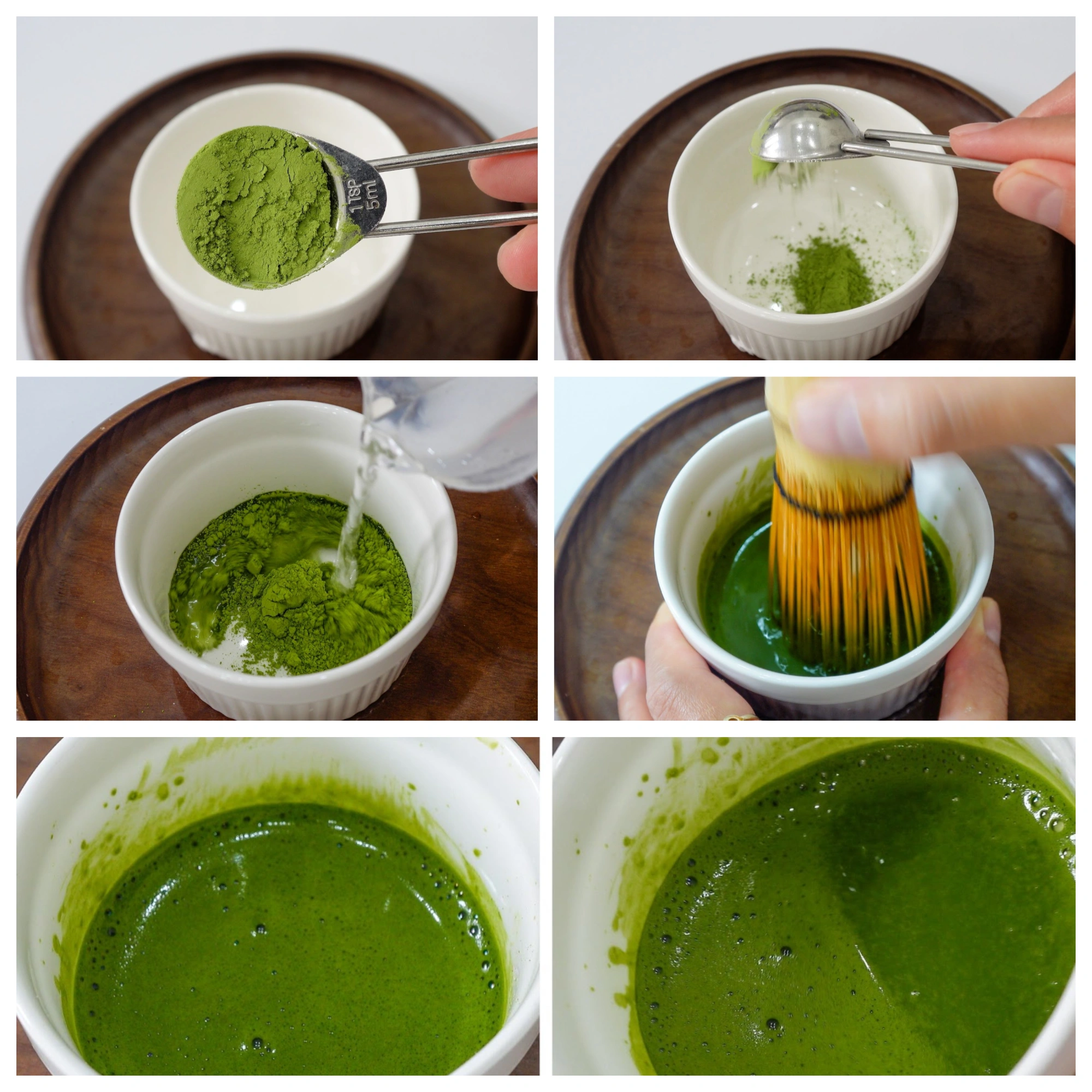 - Pha bột matcha với nước nóng 80°C, khuấy đều cho đến khi tan hoàn toàn