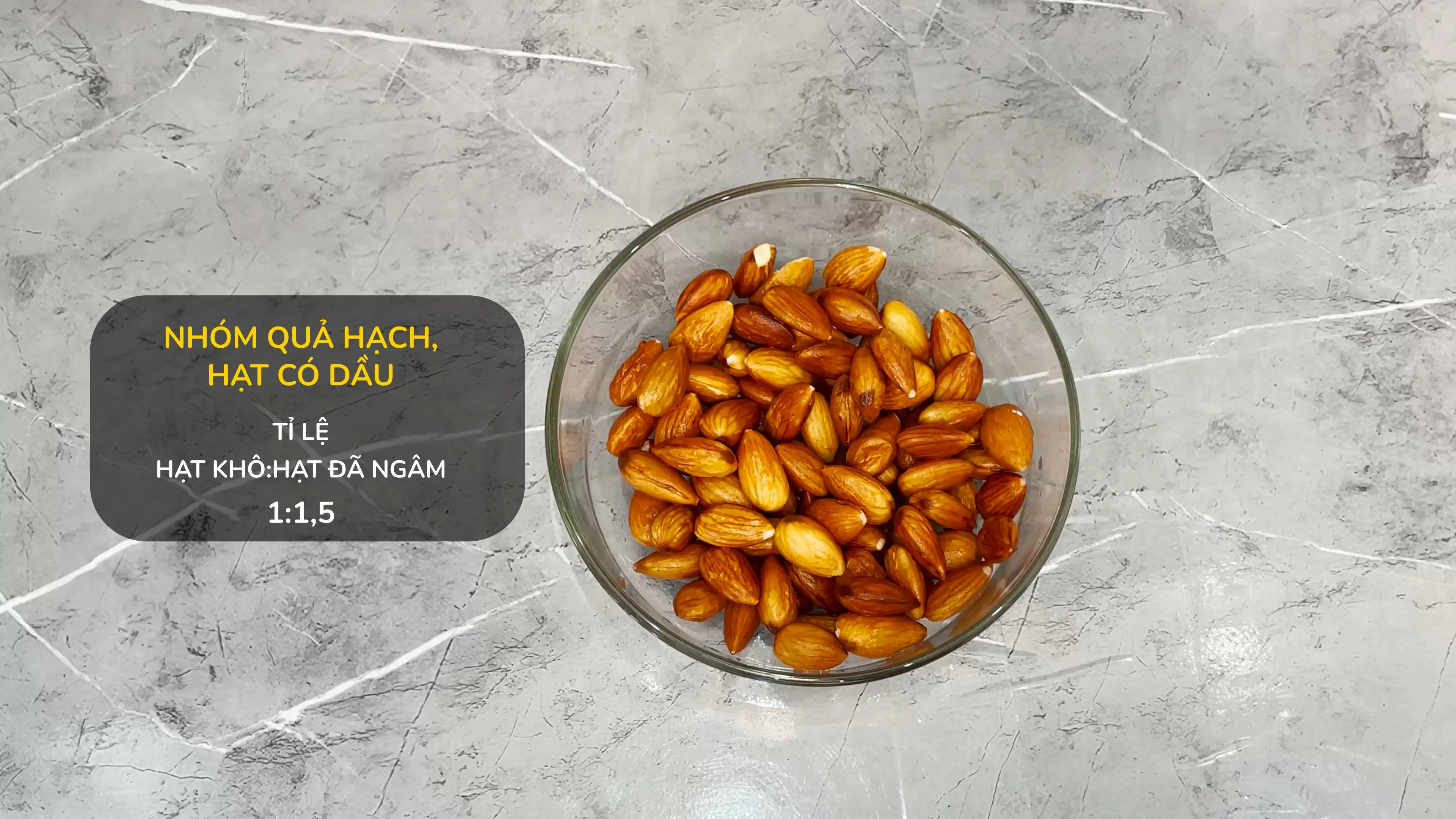 - Nhóm hạt quả hạch, hạt có dầu (như hạnh nhân, hạt điều, óc chó…): sau ngâm thường nặng gấp 1,5 lần